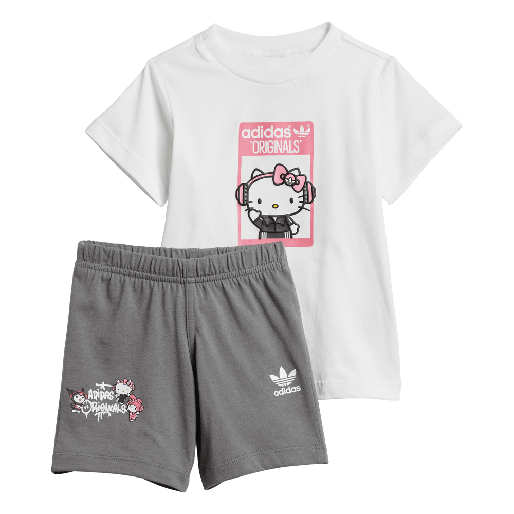 Friendship makes the world go 'round, and Hello Kitty knows it best. This co-branded set for infants brings her joyful spirit to life through iconic music references and adidas Originals style. The graphics print bonds two pop culture legends. Comfortable and easy for little ones to wear, it's perfect for playdates at the park and relaxed Sundays at home. Hello Kitty designed, adidas Originals approved.