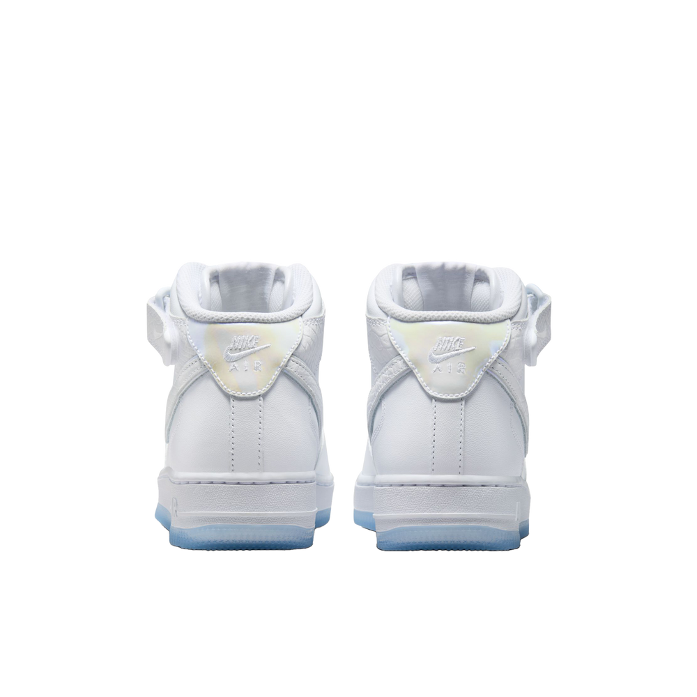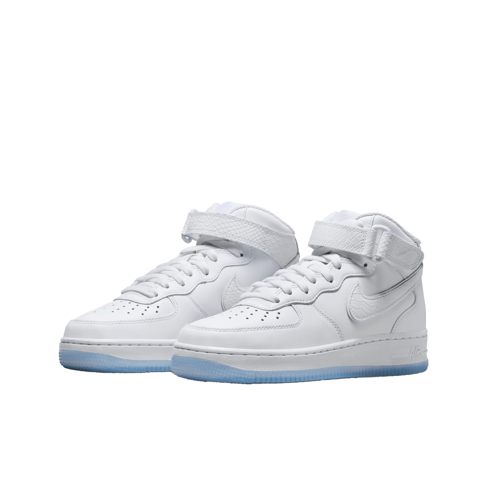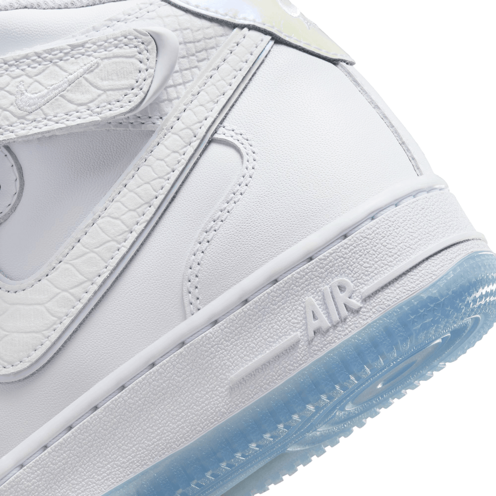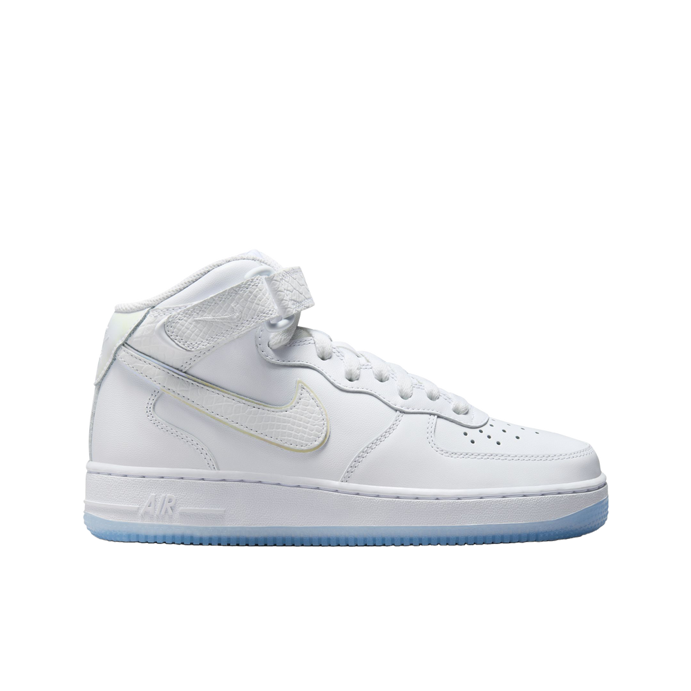 Original hoops style, mid-cut. Era-echoing, ‘80s construction, bold details and nothin’-but-net style goes up with plush padding around the ankle and hook-and-loop closure. Snakeskin-textured leather and holographic accents will have you dancing on Air.