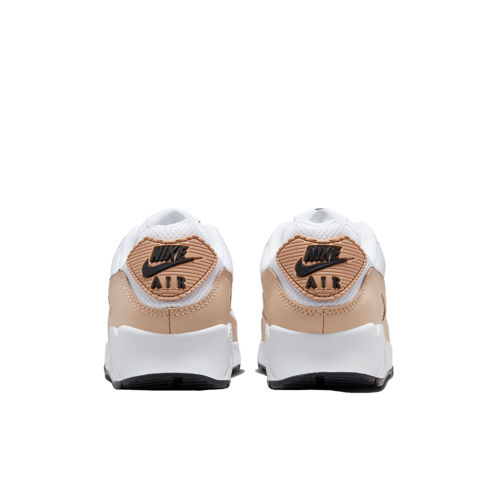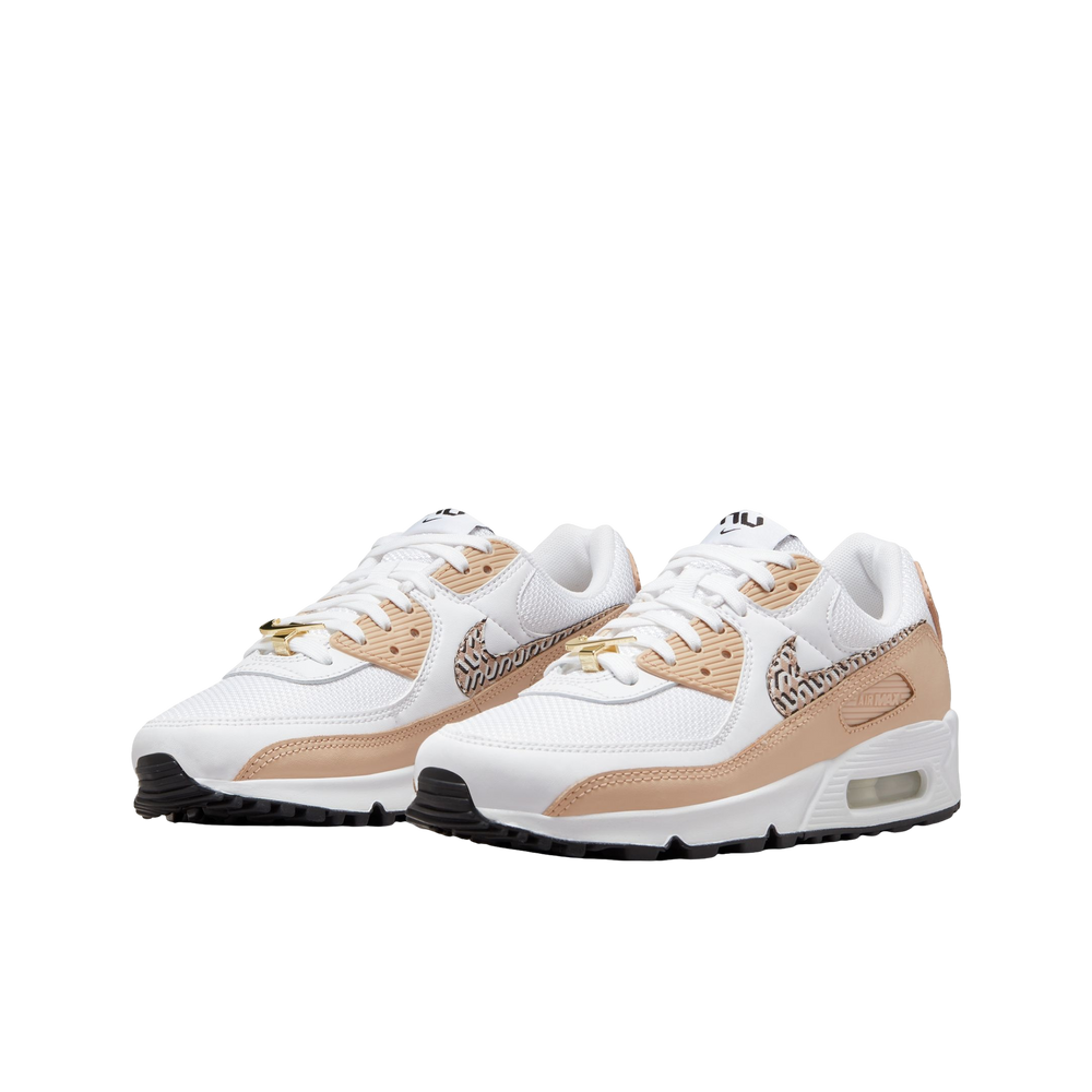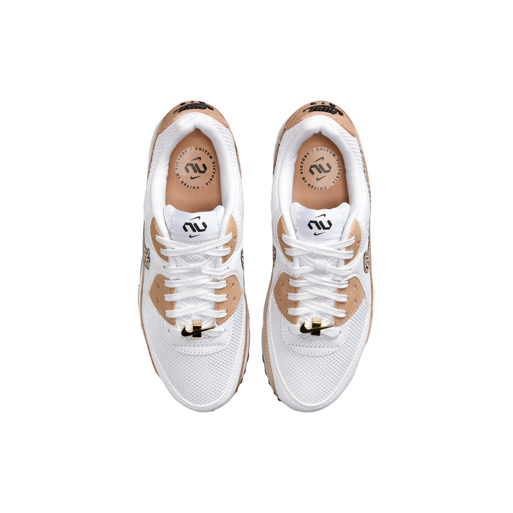 The Nike Women’s Air Max 90 ‘United in Victory’ brings a unique graphic element to the archival running shoe. Built with white mesh and a tonal leather overlay, the upper is accented with a Swoosh covered in an allover ‘UN’ print — short for ‘Nike United.’ Hemp-colored accents land on the sneaker’s molded eyelets, leather mudguard, and Nike-branded heel patch. ‘NU’ branding appears on the woven tongue tag and sockliner, while Swoosh-shaped lace jewels shine in a metallic gold finish. A white foam midsole, fitted with a visible Air-sole unit in the heel, is contrasted by a black waffle-traction rubber outsole.