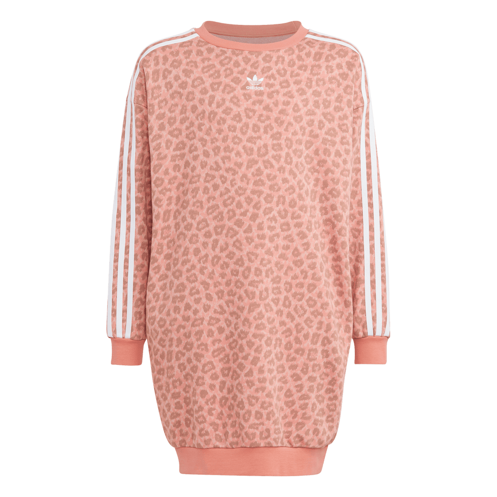 A versatile piece with a wild side, this juniors' adidas dress will leave you feeling confident and comfortable every time you pull it on. Updating a classic cheetah print with a colour shift, this long sleeve design is perfect for easy everyday wear. Its loose-fitting body, cut from a soft French terry fabric, keeps things relaxed and carefree. Dynamic 3-Stripes down the sleeves show the world your sporty side. With vibes as fresh as these, this dress is sure to become a go-to in no time.