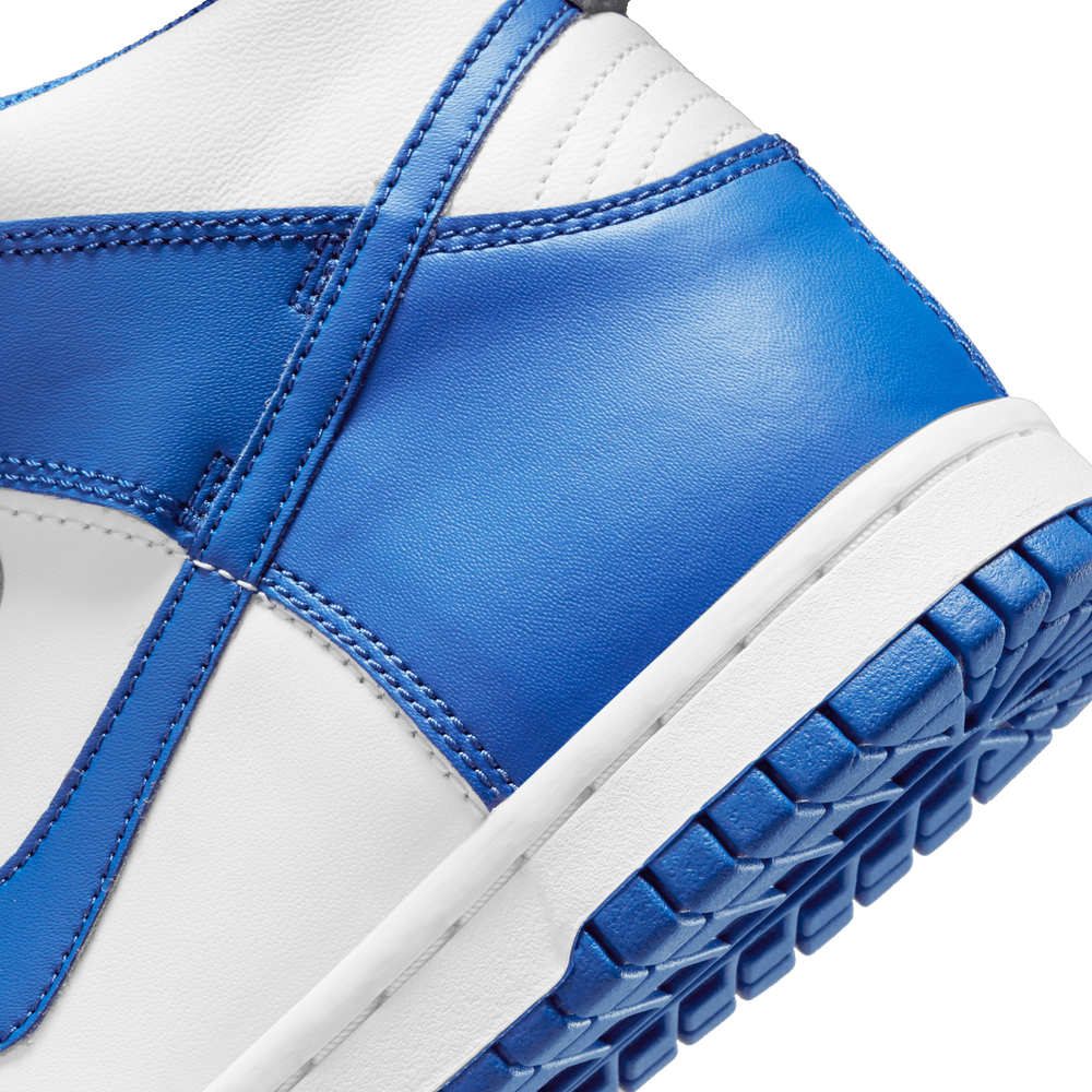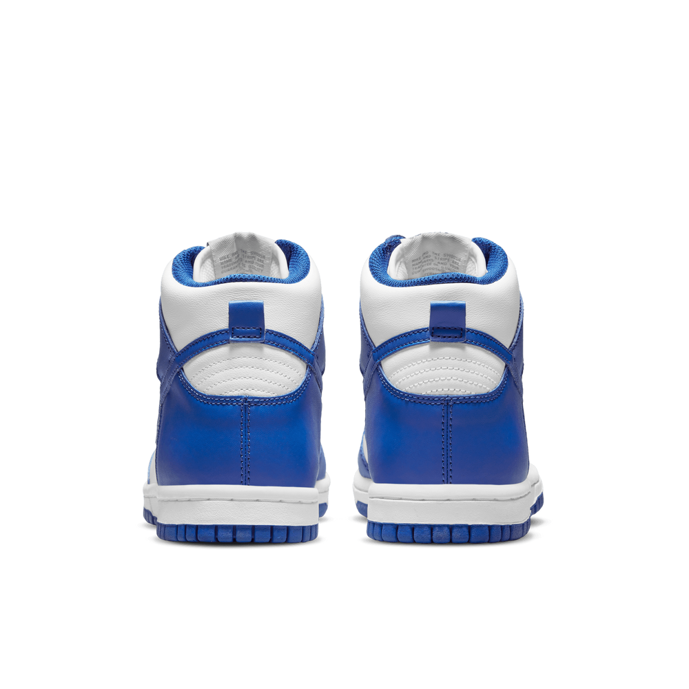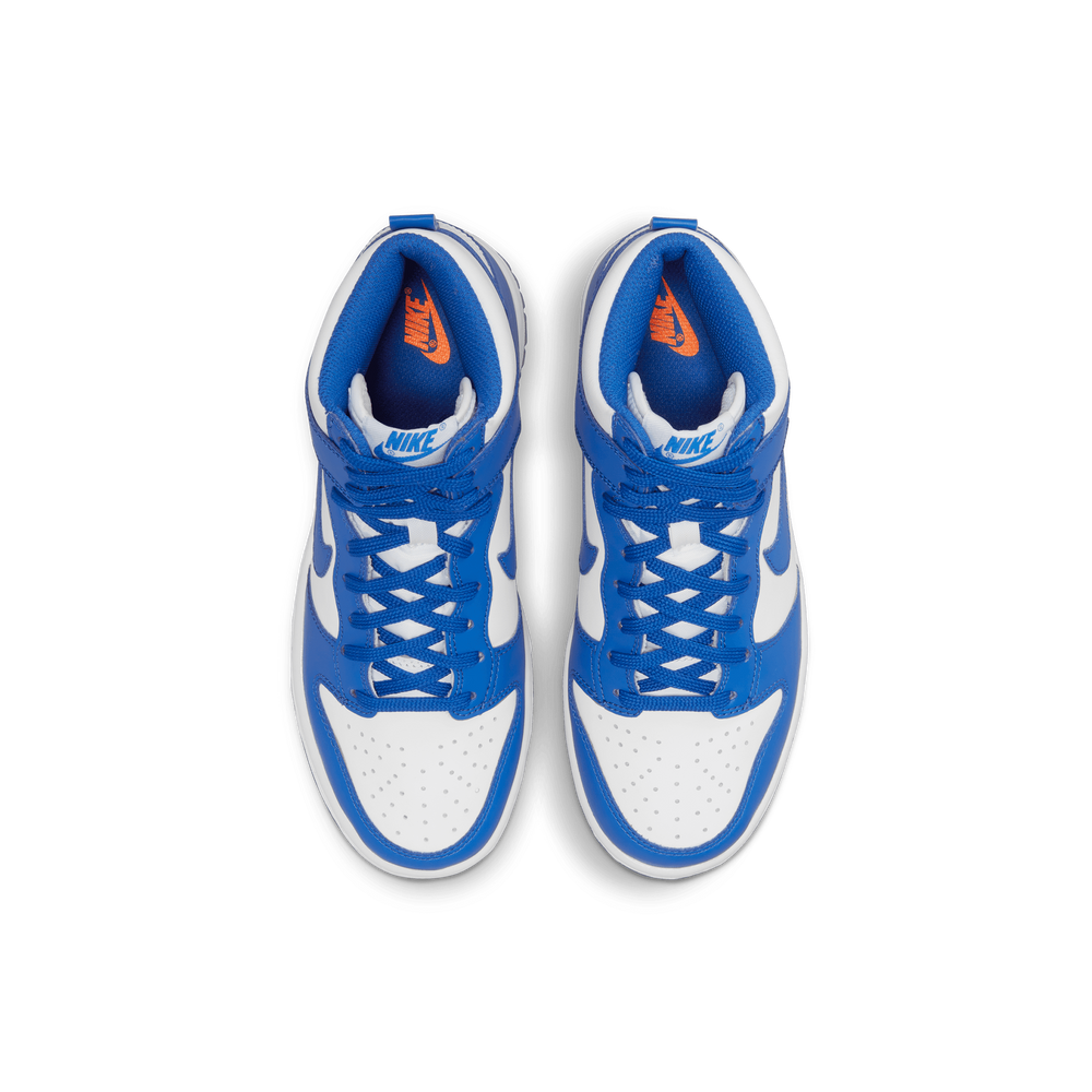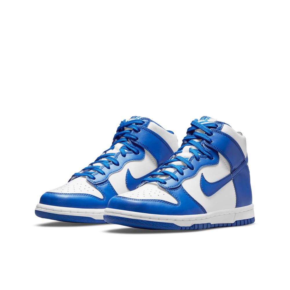 Made for big Kidss, the 2021 edition of the Nike Dunk High GS ‘Kentucky’ brings back one of the OG colorways from the iconic ‘Be True to Your School’ series from 1985. This pair pays tribute to the University of Kentucky Wildcats with a two-tone leather upper in white and Game Royal. Nike branding lands on the sockliner and the woven tag stitched atop the lightly padded nylon tongue. The high-top rides on a sturdy rubber cupsole, underpinned by a grippy outsole originally developed for the collegiate hardwood.