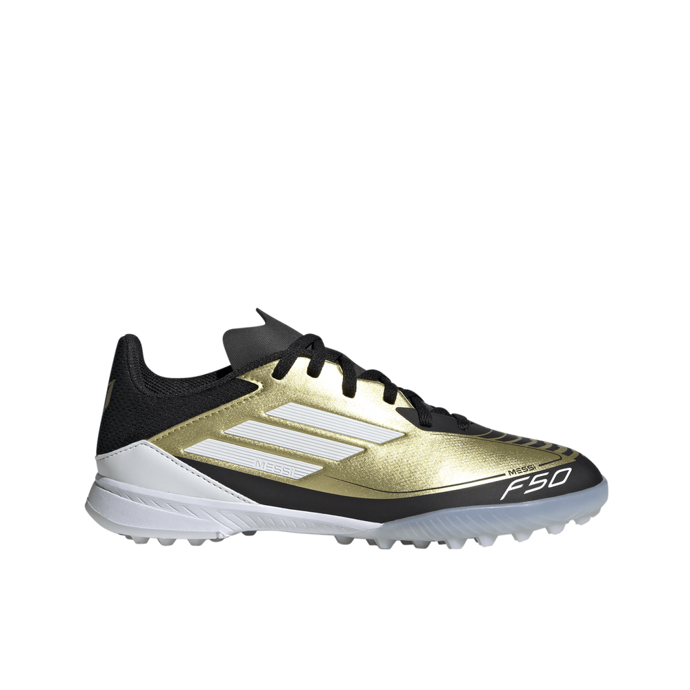 F50 speed, Messi style. In 2024, Lionel Messi's range of adidas football boots are crafted to match his preferences even more closely. The flexible HybridTouch upper on these juniors' F50 League boots includes a synthetic tongue for lightweight comfort. Underneath, a lug rubber outsole adds responsiveness on artificial turf.
