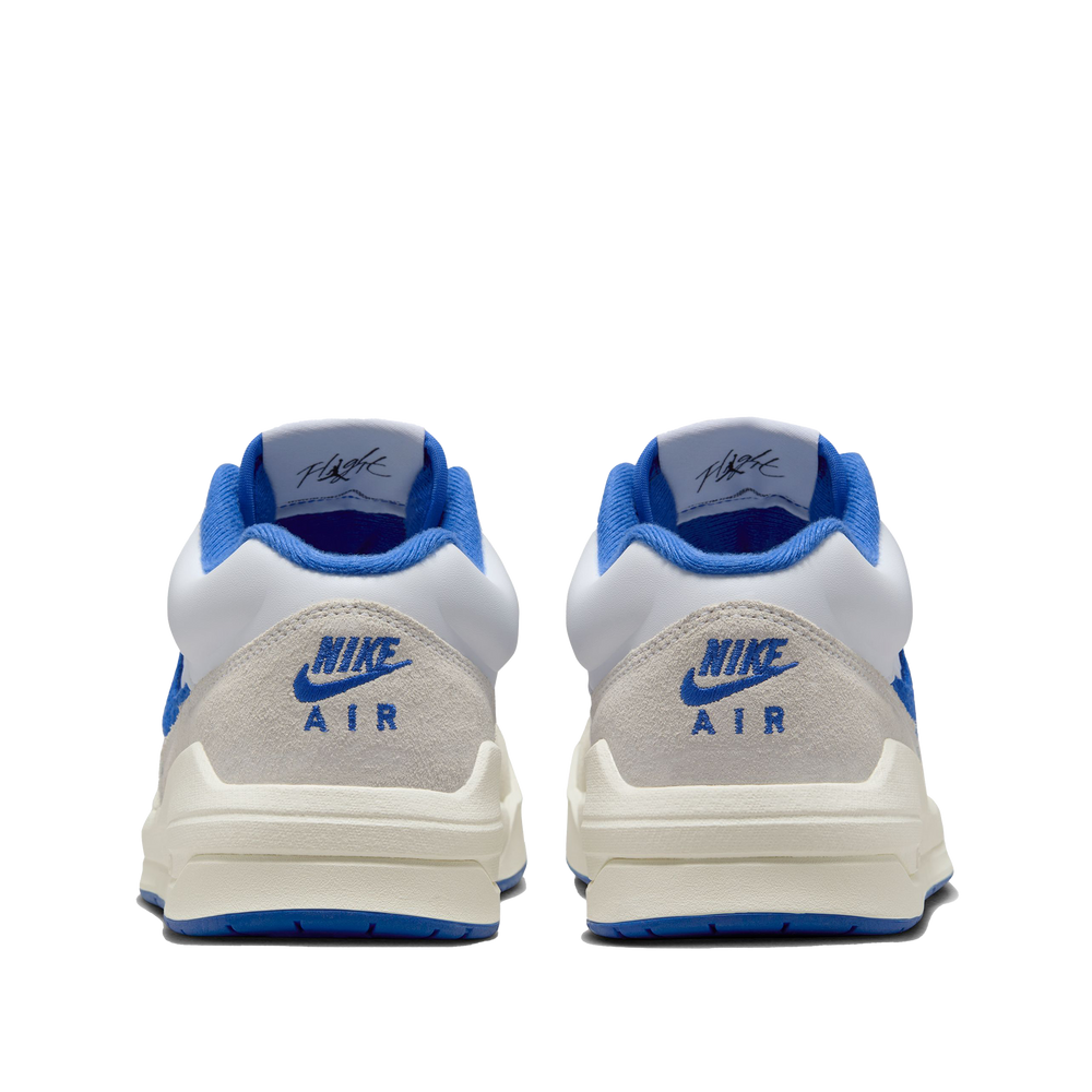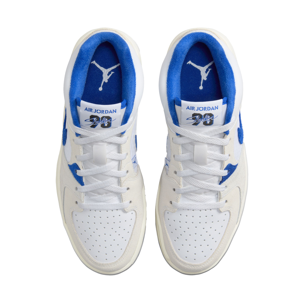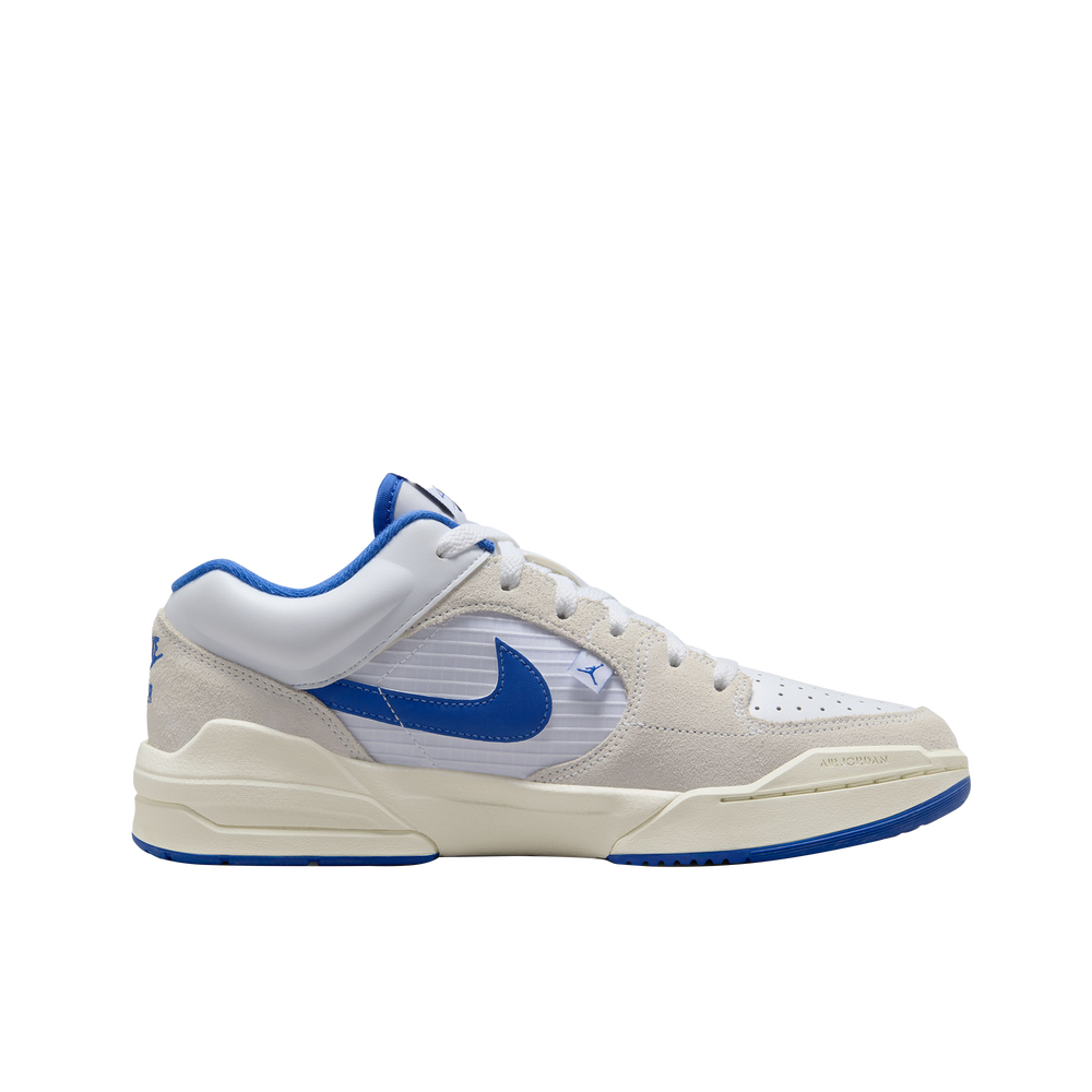 The Jordan Stadium 90 'White Game Royal' presents a retro-inspired silhouette that borrows design elements from the AJ1 and AJ5. The mixed-material upper combines a white leather base with tonal woven quarter panels and off-white suede overlays. Royal blue accents land on the signature Swoosh and textile collar lining, as well as the embroidered Nike Air logo that decorates the back heel. A vintage off-white finish is applied to the foam midsole, fitted with encapsulated Air-sole cushioning and supported by a durable blue rubber outsole.