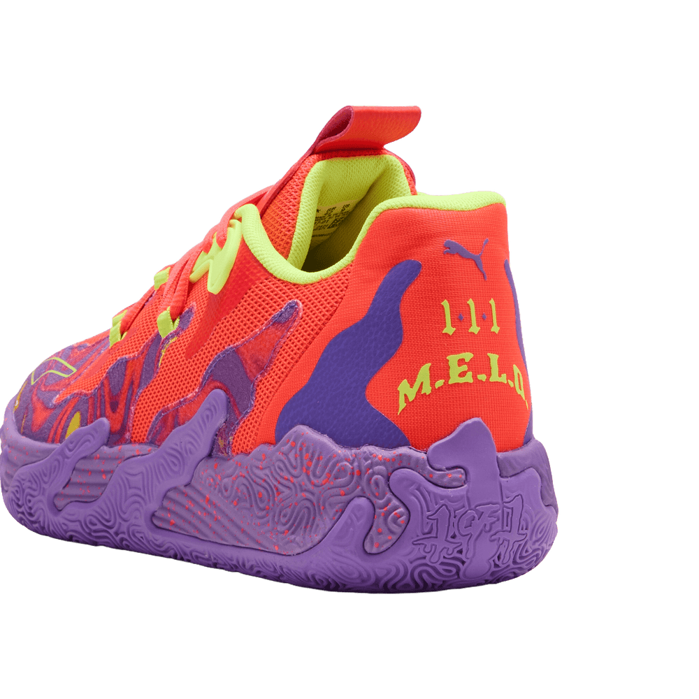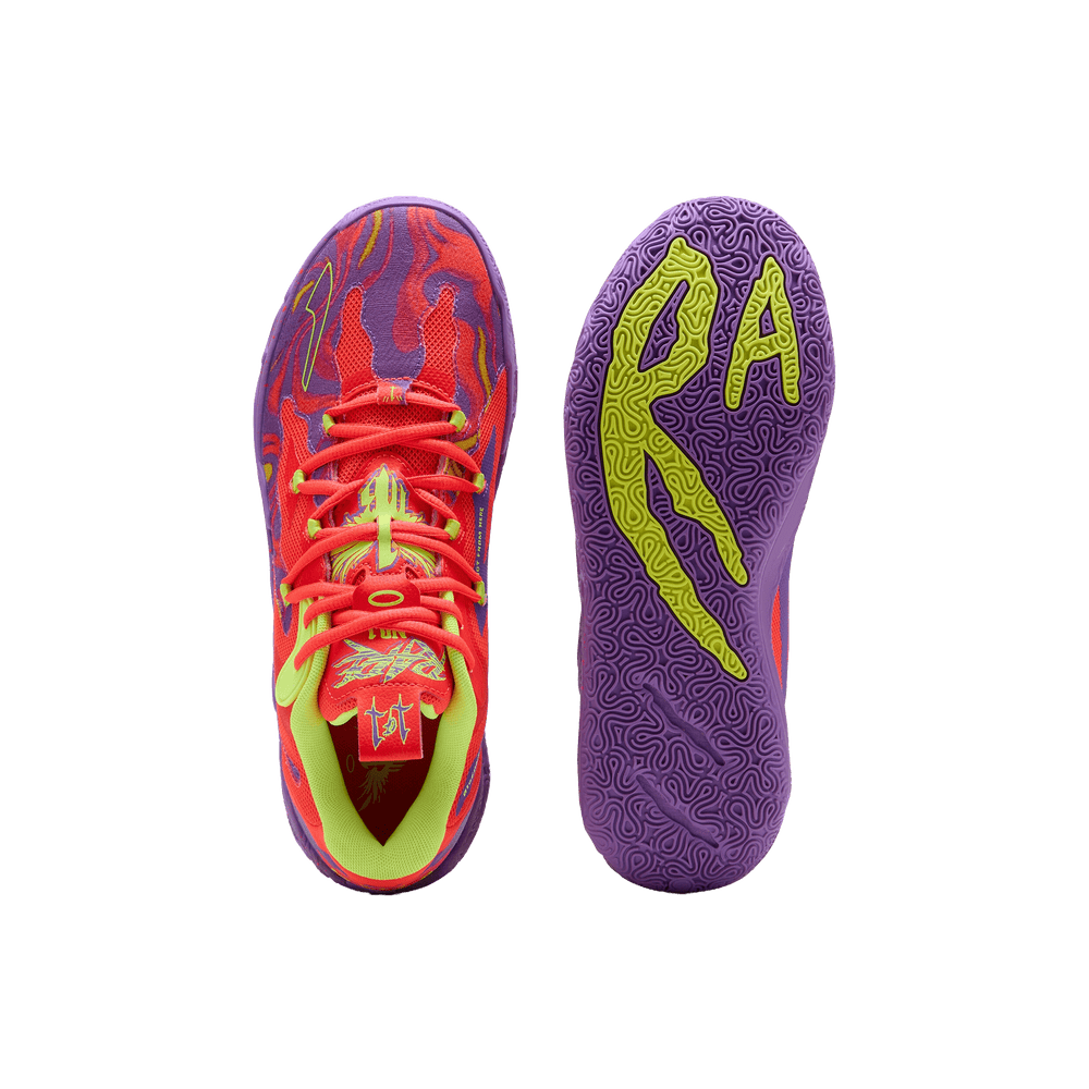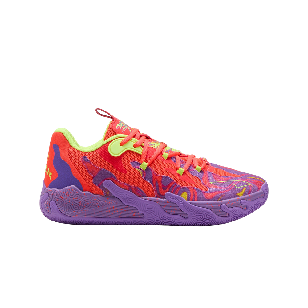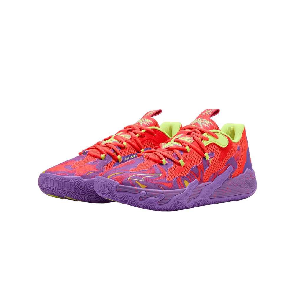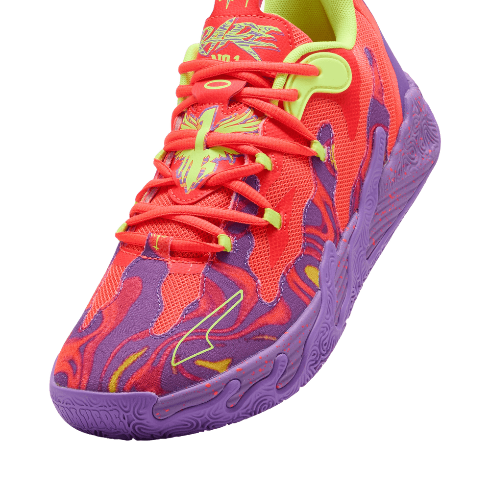 LaMelo Ball’s third signature shoe MB.03 takes a trip to the never before seen alternative universe that is the Melo world. Highlighted by slime inspired rubber wrap-ups and an engineered knit upper with scratch cutouts, the MB3 is truly Not From Here. The slime sole and space-age PUMA Hoops tech, including CMEVA foam, make tournament ready look interplanetary.