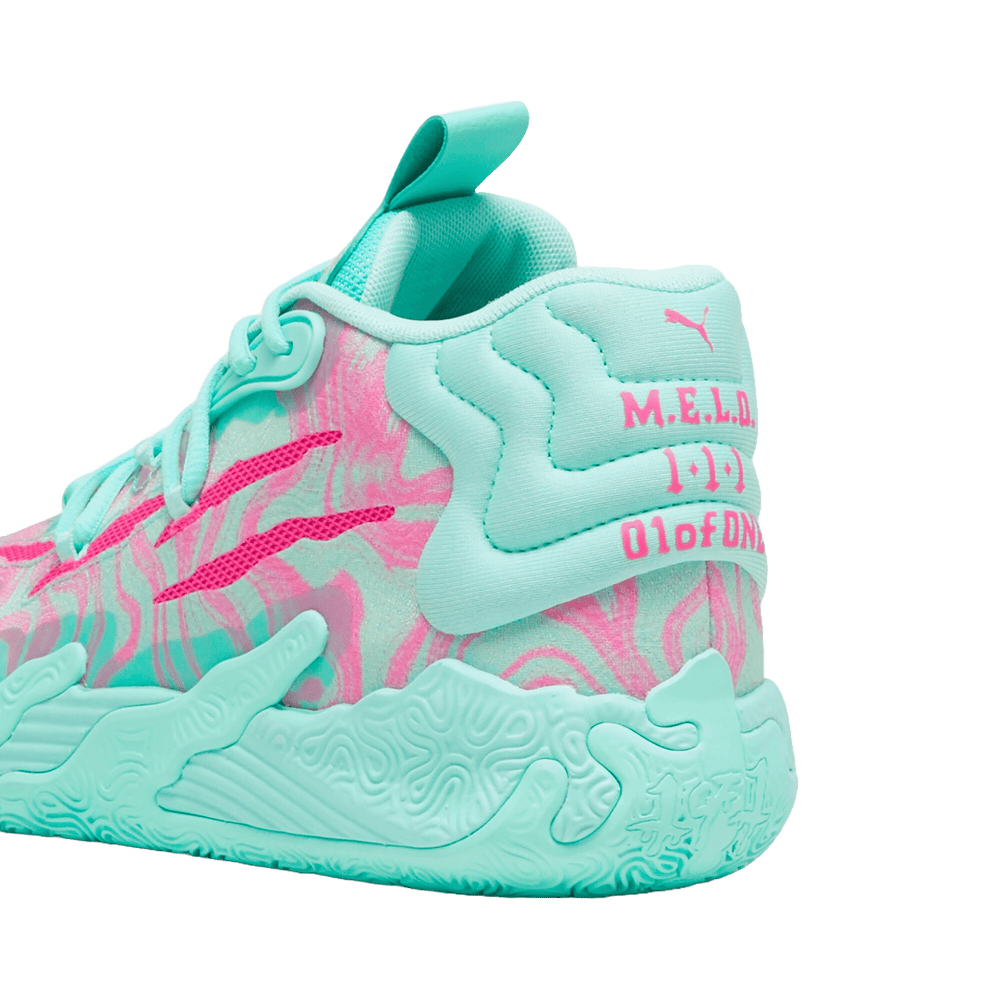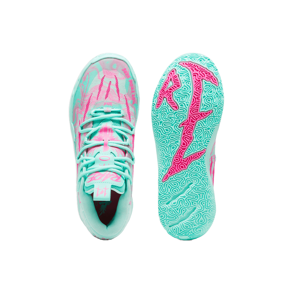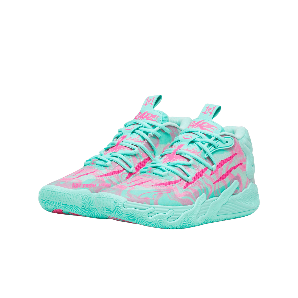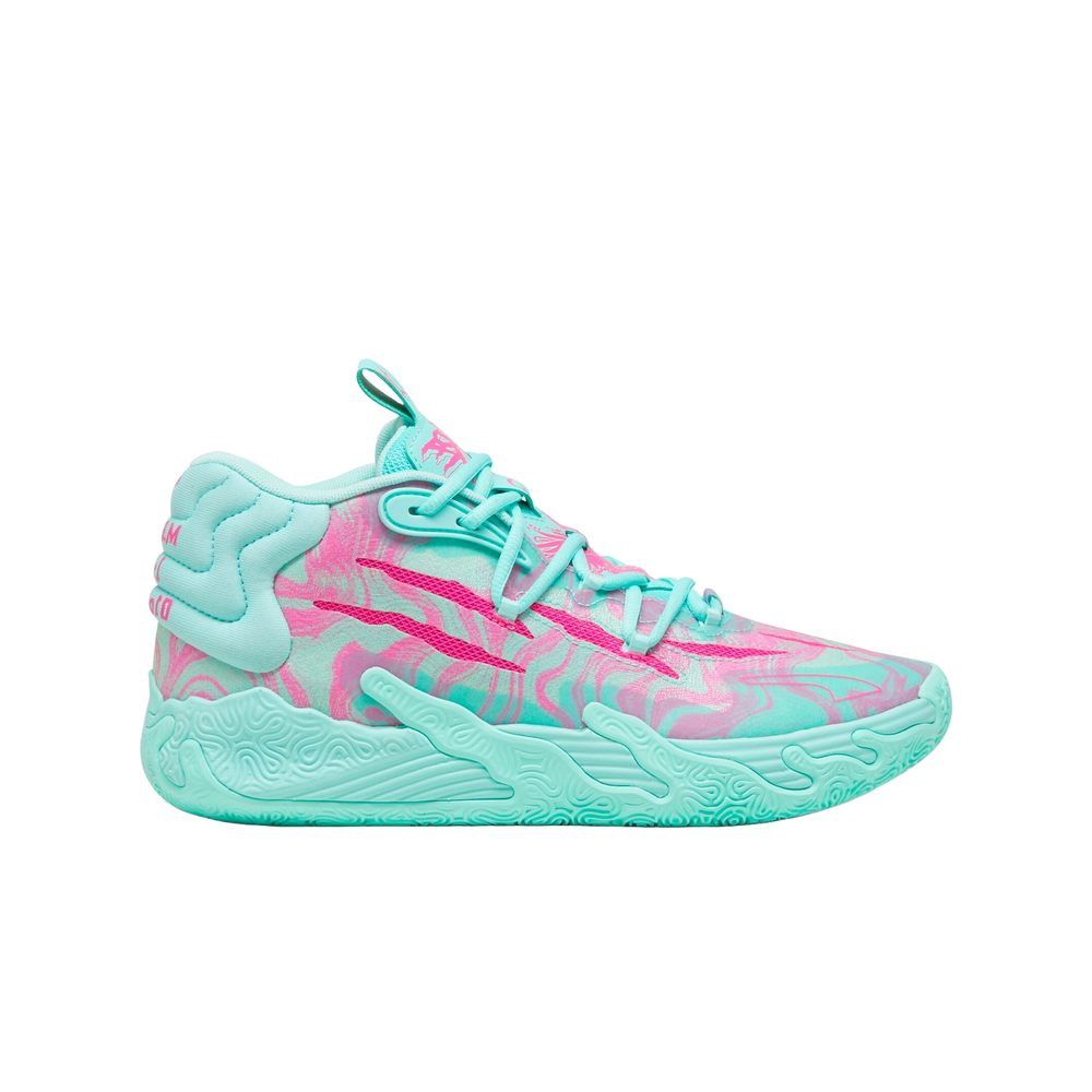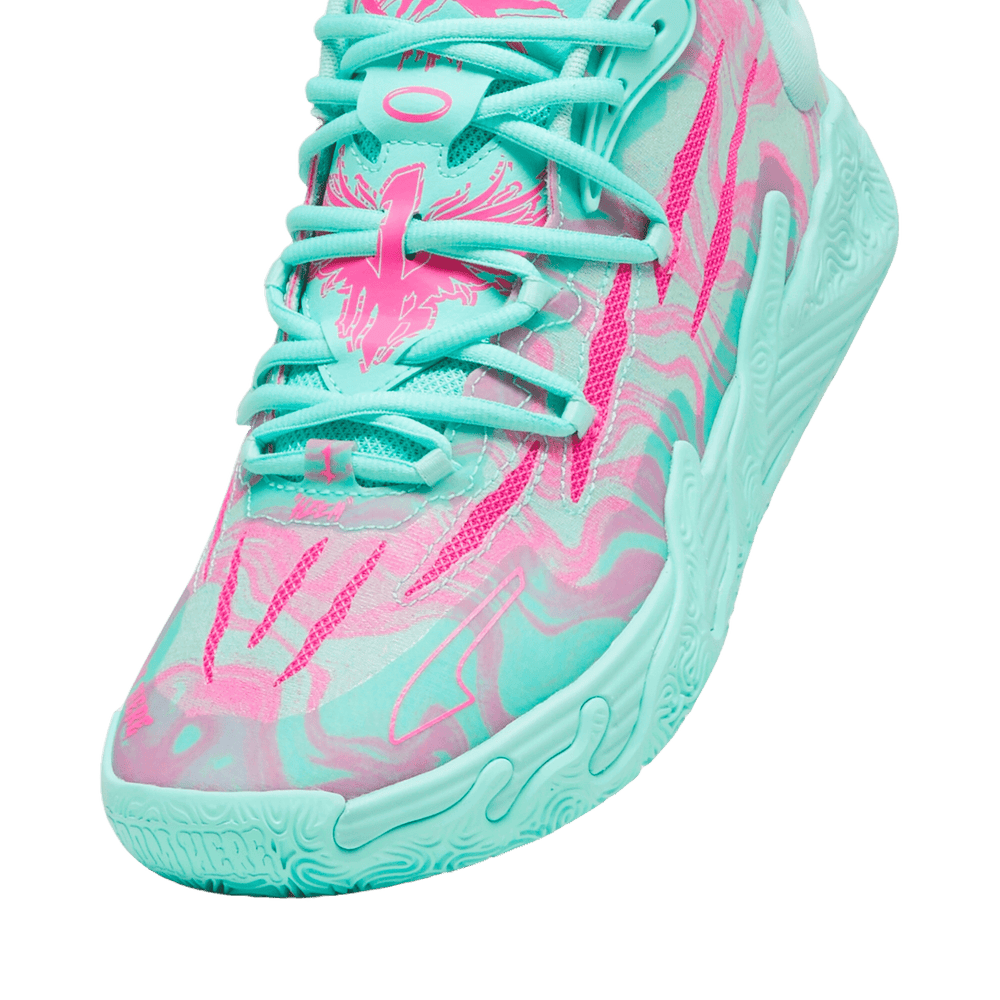 LaMelo Ball’s third signature shoe MB.03 takes a trip to the never before seen alternative universe that is the Melo world. Highlighted by slime inspired rubber wrap-ups and an engineered knit upper with scratch cutouts, the MB3 is truly Not From Here. The slime sole and space-age PUMA Hoops tech, including CMEVA foam, make tournament ready look interplanetary.