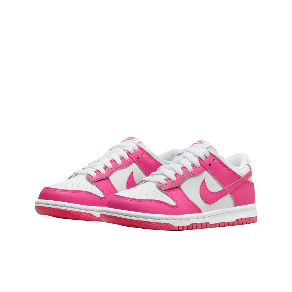 The Nike Dunk Low Laser Fuchsia (GS) offers an iconic silhouette dressed in a crisp, clean, dual colorway that Nike rolled out exclusively for kids. This sneaker sized specifically for grade school kids will garner attention on the playground with its eye-popping colors.