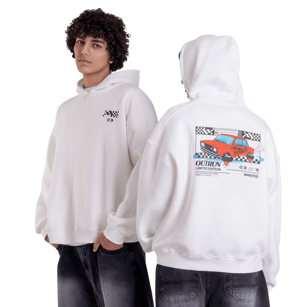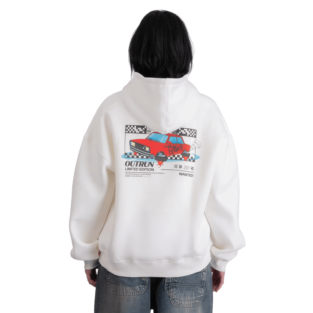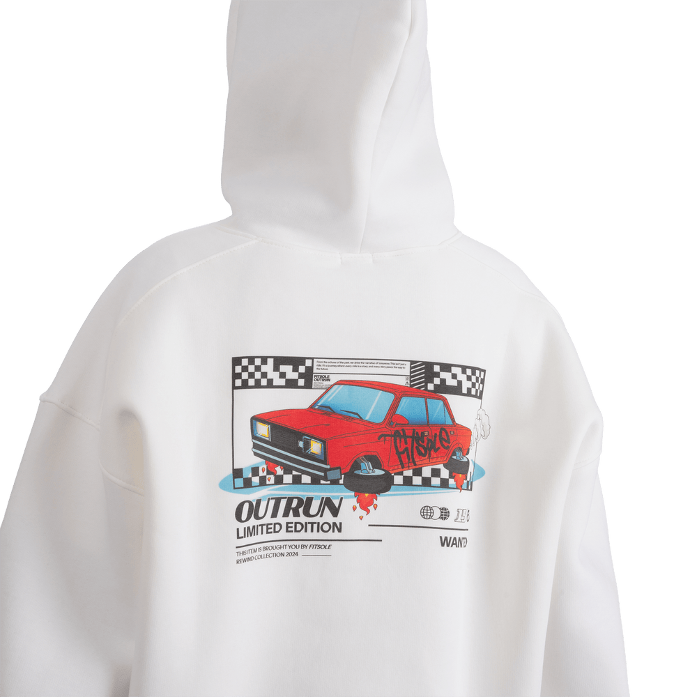 Take a trip back in time with the Outrun Hoodie in off-white, designed for those who appreciate style with a twist of retro. Featuring a boxy fit for ultimate comfort, this hoodie is made to stand out. The iconic red vintage Fitsole car on the back gives it a unique touch, channeling the spirit of speed and adventure.