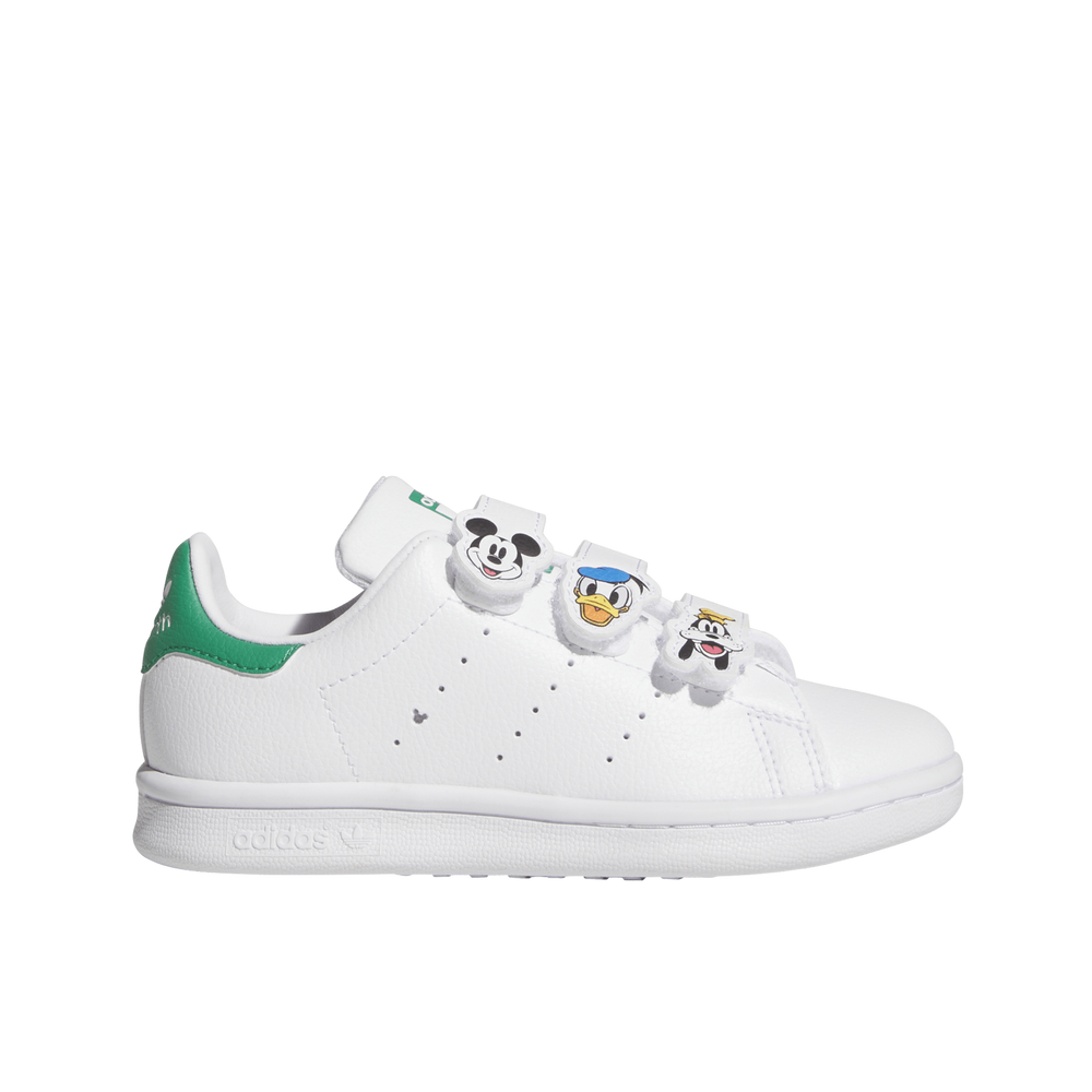 This version of the legendary Stan Smith tennis shoes from adidas Originals are sized for young fans. The hook-and-loop straps make them easy to pull on and off, while Disney's Mickey and Friends graphics bring the magic of their favourite characters. The synthetic leather upper is easy to keep clean, and the rubber outsole grips the ground.