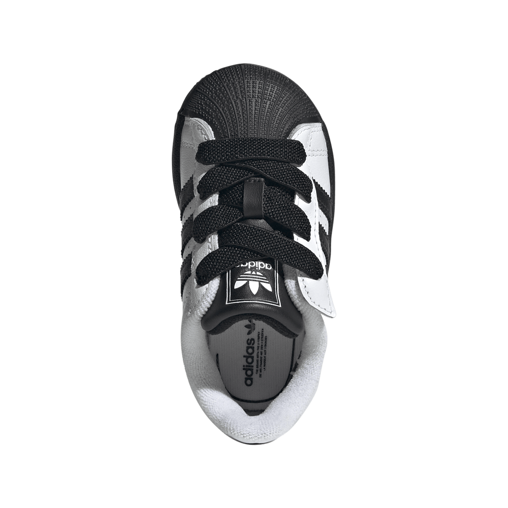 Slip this shell-toed icon onto baby's feet for a pint-sized take on an adidas Originals favourite. The adidas Superstar II is made with soft, supple leather on top of a lightweight, flexible rubber sole. The comfort closure is made up of elastic laces that stretch and open up the collar wide, so it's easy to put them onto little feet.