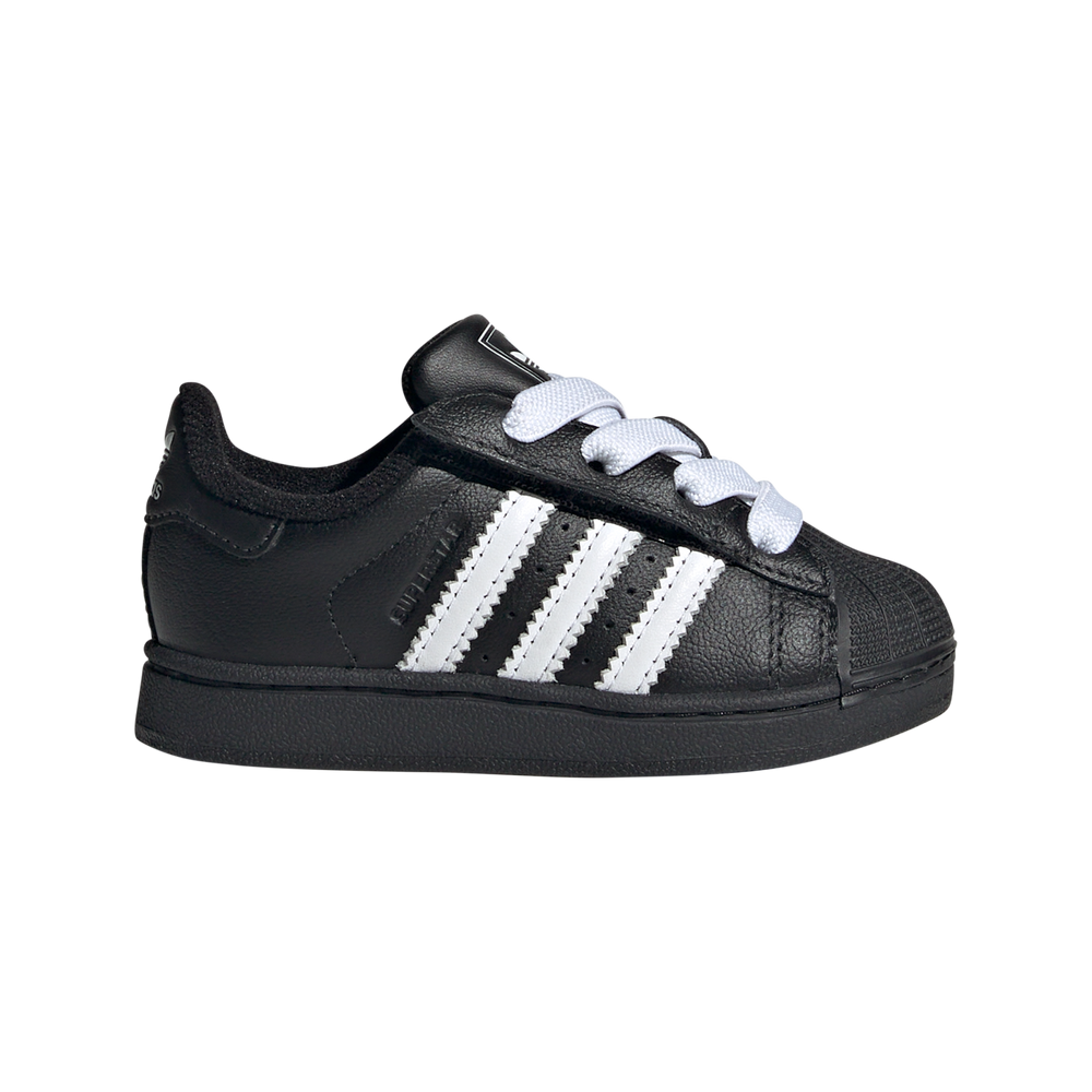 Slip this shell-toed icon onto baby's feet for a pint-sized take on an adidas Originals favourite. The adidas Superstar II is made with soft, supple leather on top of a lightweight, flexible rubber sole. The comfort closure is made up of elastic laces that stretch and open up the collar wide, so it's easy to put them onto little feet.