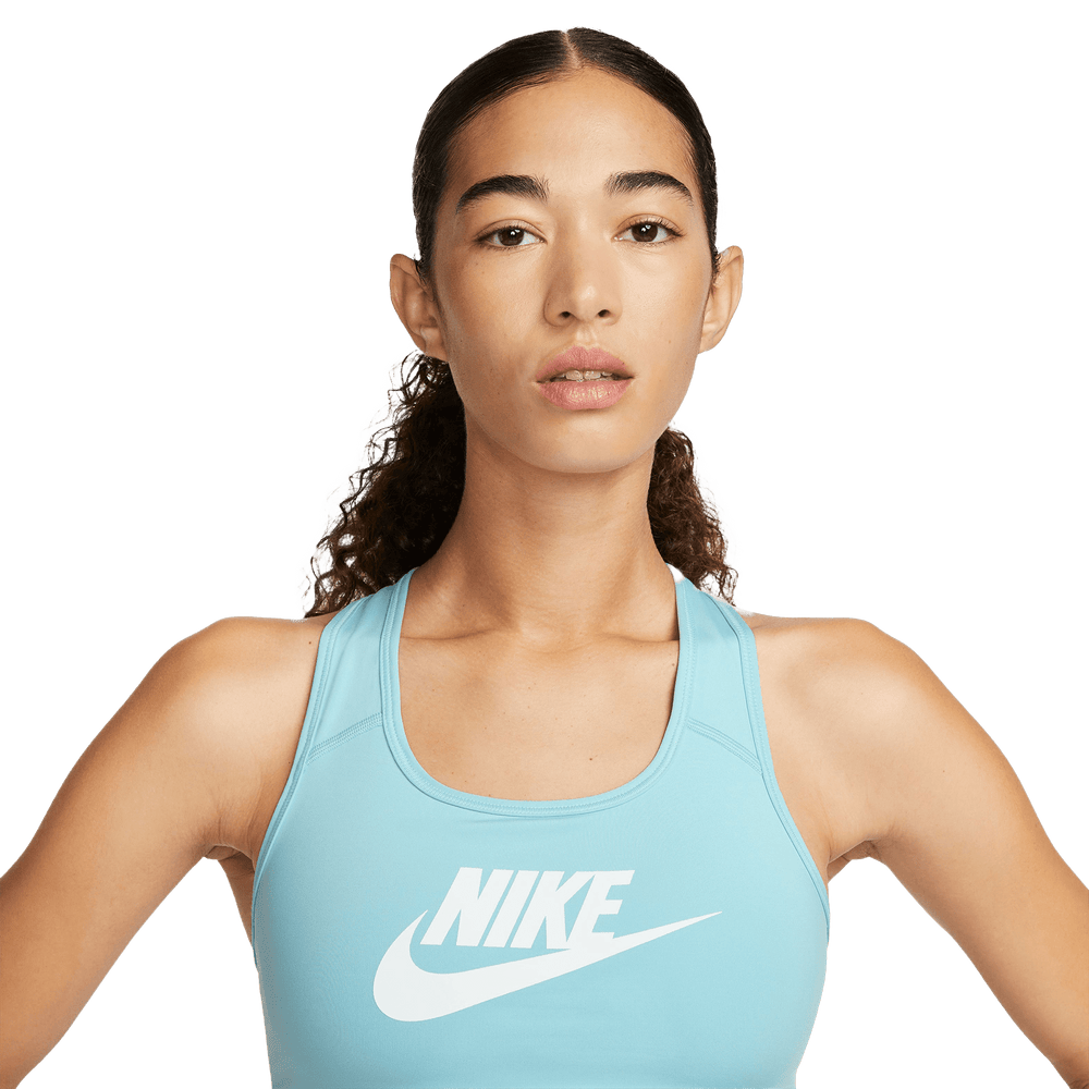 With wide, comfy straps in a classic racerback design, the Nike Dri-FIT Swoosh Sports Bra feels snug and secure while you move. Smooth, lightweight fabric, made from at least 75% recycled polyester fibres, wicks sweat to keep you dry, comfortable and focused. For every rep, step and jump—know that you're supported.